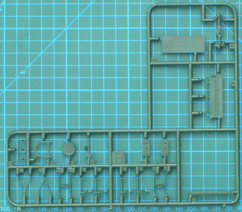 In der unpraktischen Schüttbox von Revell befinden sich gut verpackt ein kleiner Decalbogen, ein kleines Stück Klarsichtmaterial, vier dunkelgrüne Spritzlinge mit 127 Bauteilen und die etwas unpraktische aber letztlich doch übersichtliche Bauanleitung.