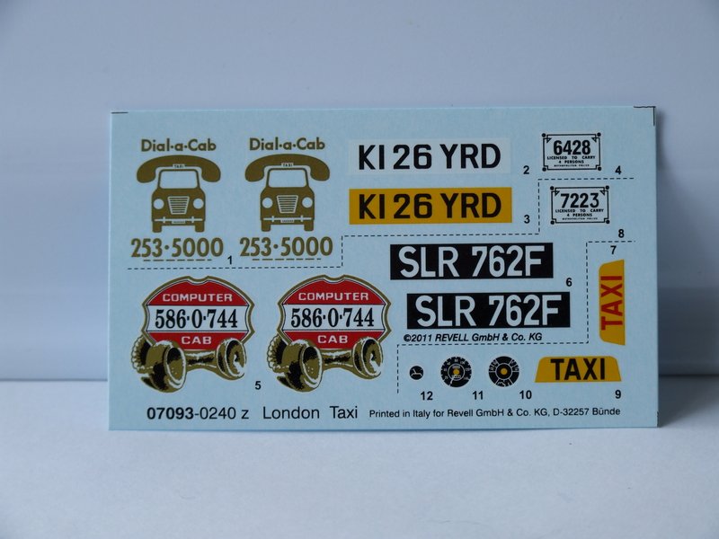 Bausatz: Die Spritzlinge sind gut ausgeformt und übersichtlich. Die Bauanleitung ist gut aufgebaut und gut beschrieben. Die beiliegenden Abziehbilder ermöglichen den Bau des Fahrzeuges in zwei Versionen. Enthalten sind auch die für britische Taxis vorgeschriebenen Lizenzplaketten und Abziehbilder für das Instrumentenbrett.
