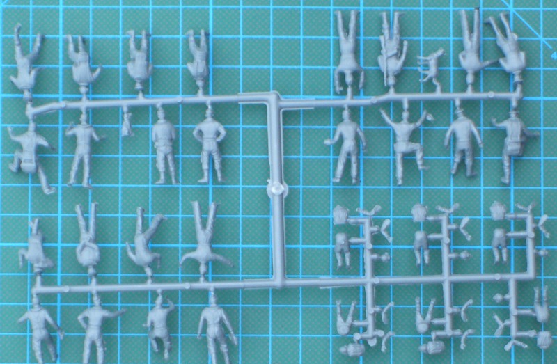 Die schön gestaltete Schüttbox enthält nicht weniger als 30 unbemalte Figuren, die aus 54 Teilen bestehen. Schaut man sich die Sachen an, dann kommt einen das schon mal sehr bekannt vor. Drei Viertel des Spritzlings ist belegt mit den Figuren die schon aus dem altbekannten Preiserset bekannt sind. Lediglich sechs sitzende Piloten sind neueren Datums und bestehen aus jeweils aus fünf bzw. vier Bauteilen. Die Detaillierung dieser sechs Figuren ist herausragend. Leider ist dafür u.a. der Liegestuhl und das 200l Fass nicht mehr vorhanden.