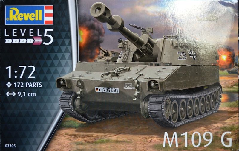 Bausatz: Revell ist in 1:72 wohl einer der wenigen Hersteller, die regelmäßig Bundeswehrfahrzeuge herausbringen. Umso schöner war es für mich zu hören, dass nun auch die alte M109 Panzerhaubitze in der Version G erschienen ist. Das actionreiche Deckelbild des bunten Faltkartons lässt mich etwas schmunzeln. Dagegen sucht man die Angaben zum Vorbild oder zu den Bemalungsvarianten leider vergebens auf dem Karton.