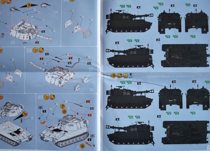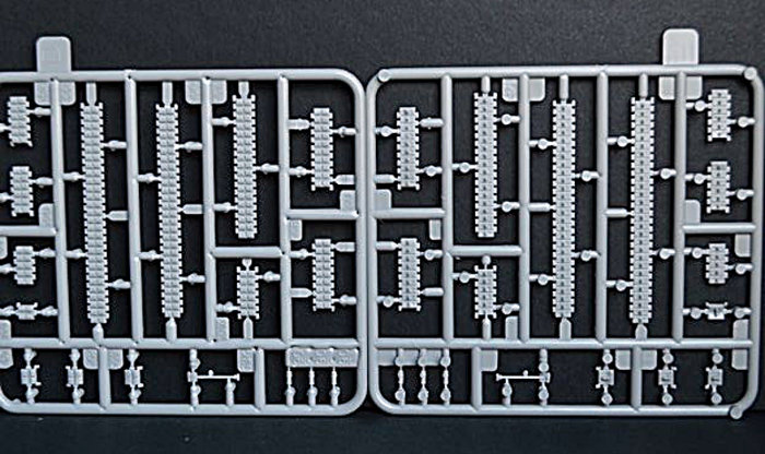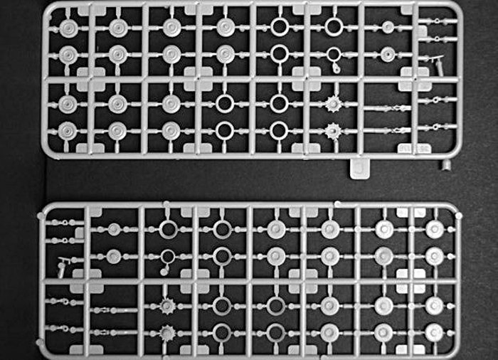 Wie bei den meisten Herstellern üblich beginnt der Bau auch hier mit der Wanne. Gleich zu Beginn muss an mehreren Teilen gebohrt und geschliffen werden, was für Anfänger eine große Herausforderung sein dürfte. Nach dem Zusammenkleben der Wanne folgt das Laufwerk. Hier ist ungewöhnlich, dass die Laufrollen aus 3, statt aus 2 Teilen bestehen: die äußeren Gummibandagen müssen noch zusätzlich angeklebt werden, was jedoch bei der Bemalung einiges erleichtern dürfte. Außerdem kann man noch entscheiden, ob man sein Fahrzeug mit aus- oder eingefahrenen Erdspornen für die Feuerstellung oder den normalen Betrieb darstellen möchte.