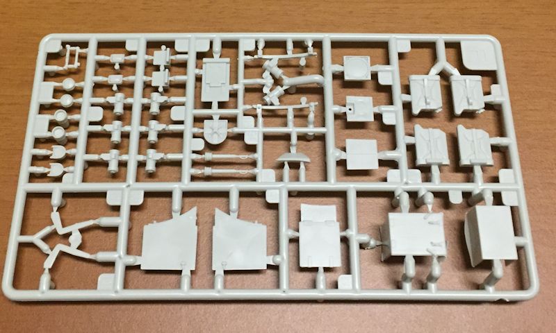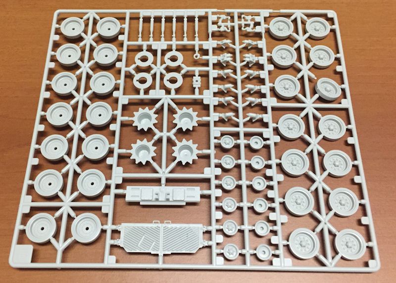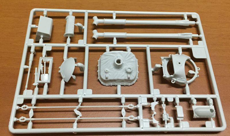 Der Bausatz enthält sechs Spritzlinge mit 235 Teilen, zwei Vinylketten, eine Anleitung sowie einen kleinen Bogen mit Wasserschiebebildern. Zusätzlich ist auf der Anleitung ein Draht aufgeklebt, der für die Darstellung der zwei Antennen genutzt werden kann.