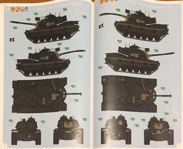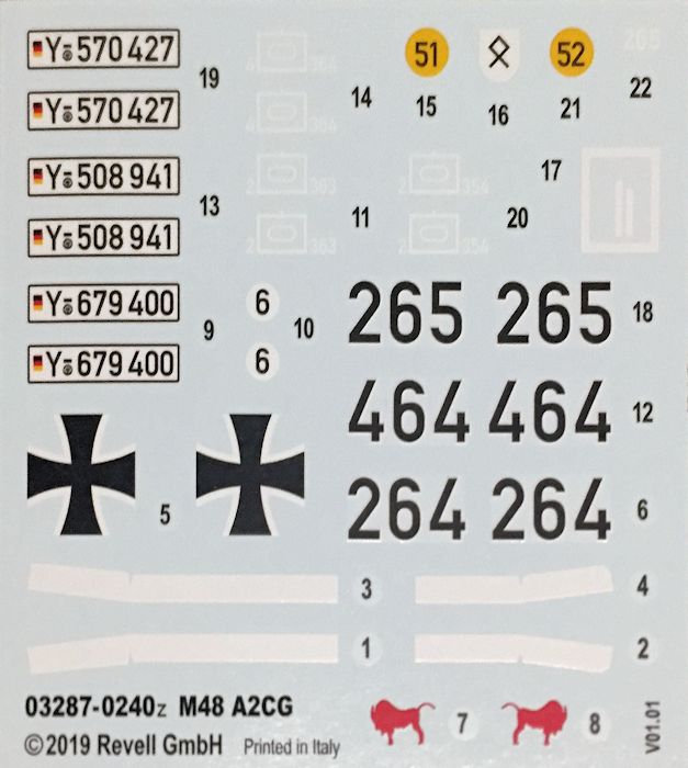 Bauanleitung/ Bemalung: Die Bauanleitung im neuen Revellstil ist farbig und übersichtlich. Bei den Wasserschiebebildern handelt sich um die Markierungen für die Panzerbataillone 363, 364 und 354 aus dem Jahr 1974.