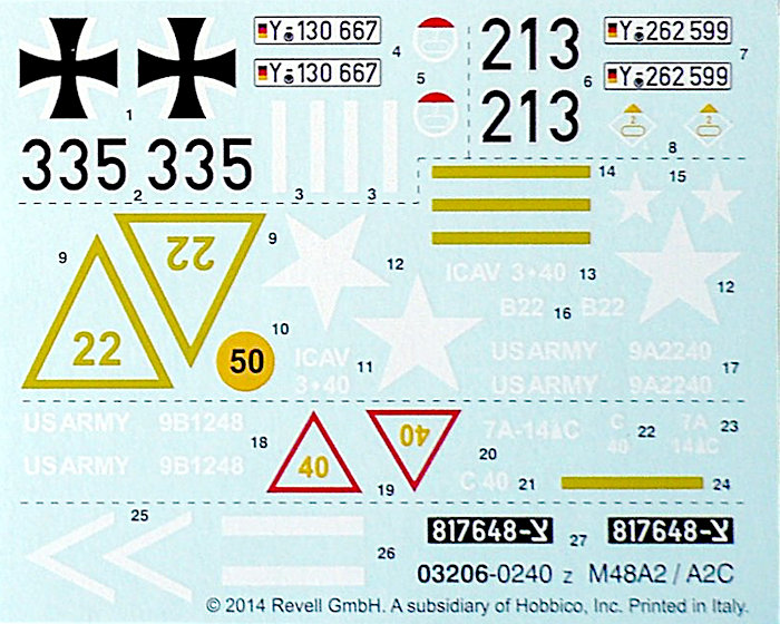 Bemalungsvarianten: Die Bemalungsanleitung, bezogen auf das Farbensortiment von Revell, gibt fünf darstellbare M48 an. Die Abziehbilder sind sauber und randscharf gedruckt.