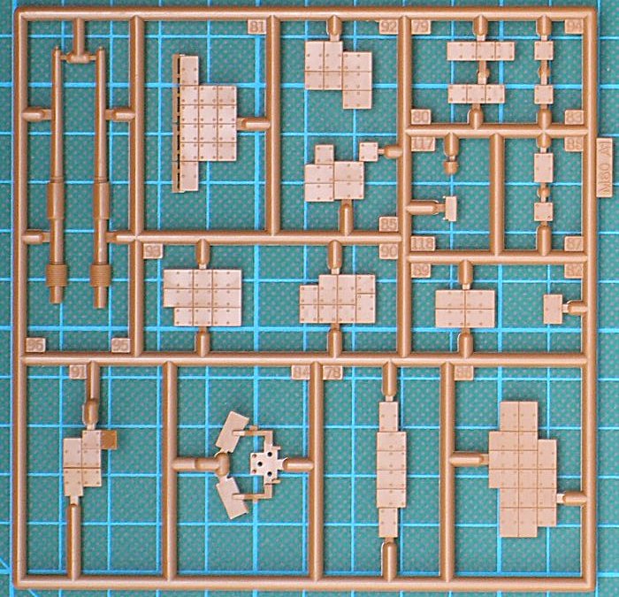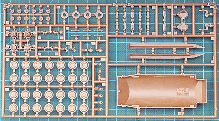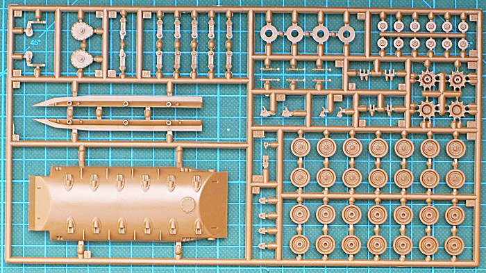 Der erste Eindruck ist sehr gut. Es gibt eine Menge Bauteile für den Fahrwerksbereich und eine hervorragende Wanne. Ein hervorzuhebender Vorteil ist, dass jeder Schwingarm separat montiert werden kann. Somit kann das Fahrzeug entsprechend mit einem dem Untergrund angepassten Fahrwerk gebaut werden. Schön! Die gut gemachte Kette liegt in Segmenten bei.