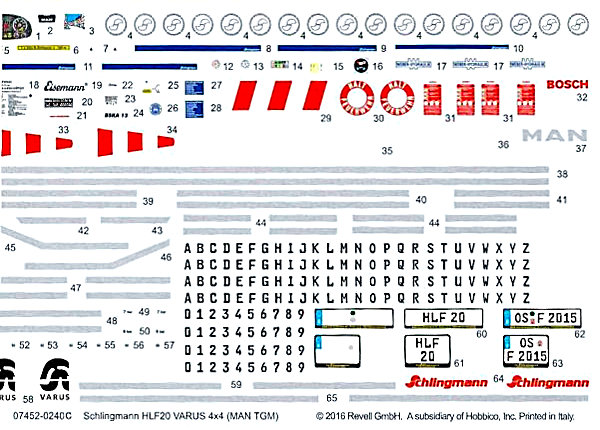 Bausatz: Der Karton ist bis zum Rand mit einzeln verpackten Spritzrahmen in weißem Plastik gefüllt, die nach Baustufen separat in Tüten verpackt sind. Der Bausatz enthält insgesamt 295 Teile und ist laut neuer Revell Definition ein Level 4 Bausatz. Leider sind die Teile - im Gegensatz zu älteren Bausätzen nur einfarbig abgespritzt. Auch die Felgen sind in weiß gehalten. Die HLF 20 hat das ganze Zubehör diese Einsatztyps, leider sind jedoch einige Teile, wie z.B. der Spaten aufgeprägt, und dies im Maßstab 1:24. Andere Hersteller haben selbst im Maßstab 1:87 oder kleiner separates Werkzeug dabei.