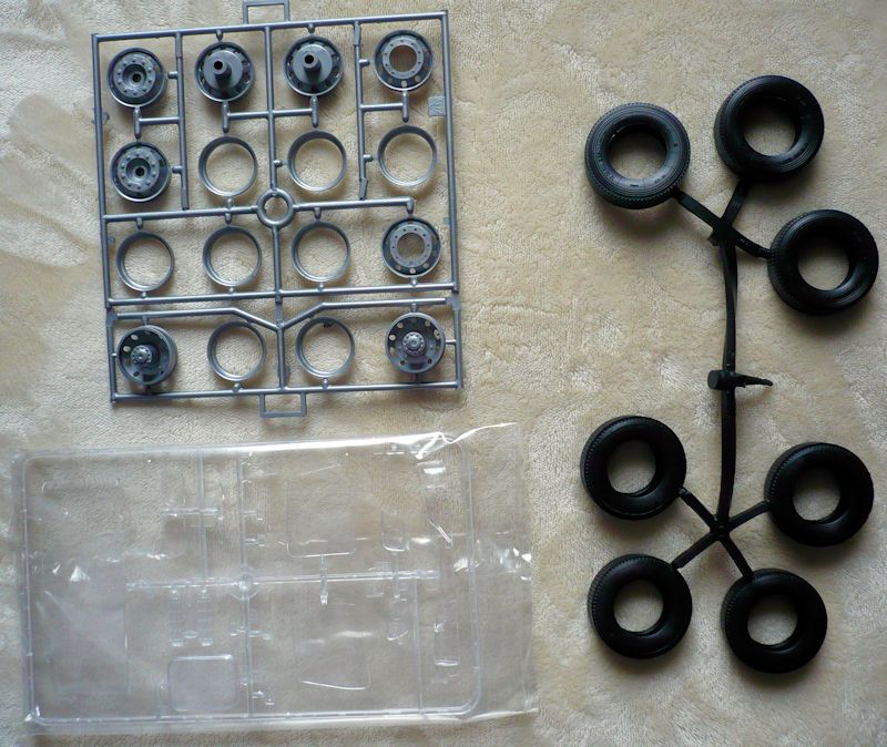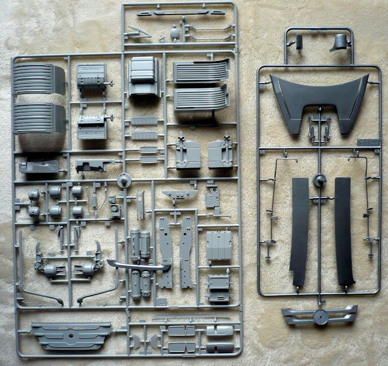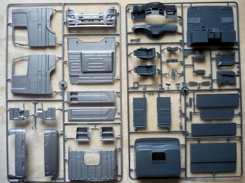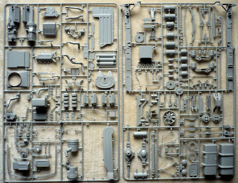Bausatz: Der Bausatz besteht aus gesamt 292 Einzelbauteile, verteilt auf acht Spritzlinge, einem Spritzling mit sieben Vinylreifen und einem reichhaltigen Abziehbilderbogen. Gebaut hat der Truck die imposante Länge von knapp 26 cm. Die detaillierte Karosserie und Chassis weisen detaillierte Oberflächenstrukturen auf. Der Rahmen besteht aus mehreren Teilen. Das 2-achsige Fahrgestell verfügt über eine bewegliche Vorderradlenkung. Die Räder sind ebenfalls beweglich, genauso authentisch und detailliert dargestellt wie die dazu gehörigen Aufhängungen. Die großflächige Frontscheibe erlaubt einen großzügigen Blick in die Fahrerkabine. Das Führerhaus selbst lässt sich nach vorne kippen wobei der mehrteilige Motor voll zur Geltung kommt. Die 24-seitige Bauanleitung führt einfach und übersichtlich durch 100 Bauabschnitte.