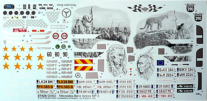 Bemalungsvarianten: Die Bemalungsanleitung bezieht sich auf das Farbensortiment von Revell. Die Abziehbilder sind sauber und randscharf gedruckt und man hat die Qual der Wahl zwischen drei Dekorationen. Die originalgetreuen Kennzeichen verschiedener Nationen (D, A, B, CH, E, F, GB, I, NL, S, PL, RUS) runden den Abziehbilderbogen ab.
