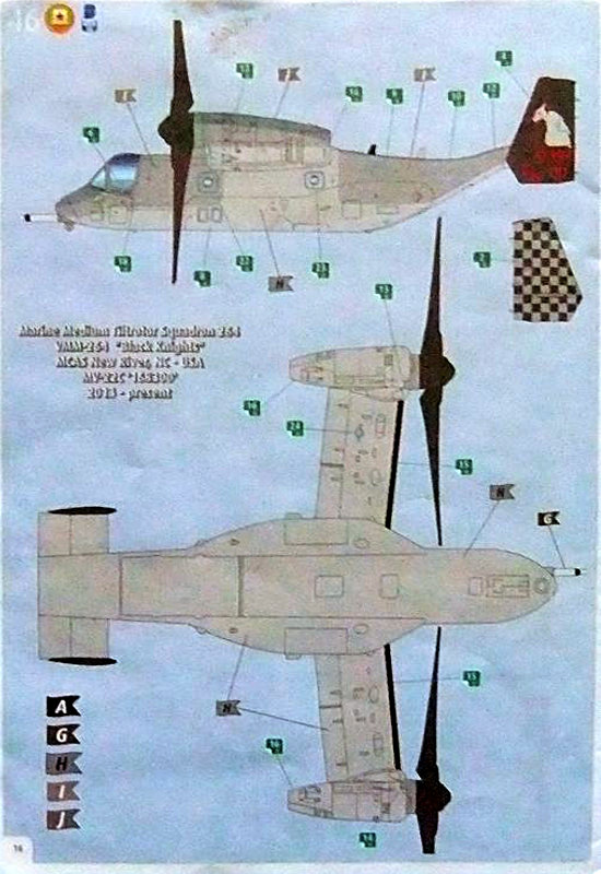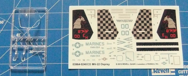 Bemalung: Revell schlägt eine VM-22C der "Black Knights" , also der schwarzen Ritter, des U.S. Marine Korps aus dem Jahre 2013 vor. Dafür gibt es eine diesmal nicht so übertriebene Sondermarkierung für die Seitenleitwerke. Decals für die Gestaltung im Cockpit hätte ich mir auch gewünscht.