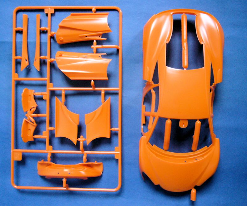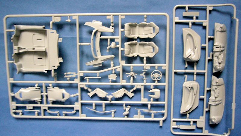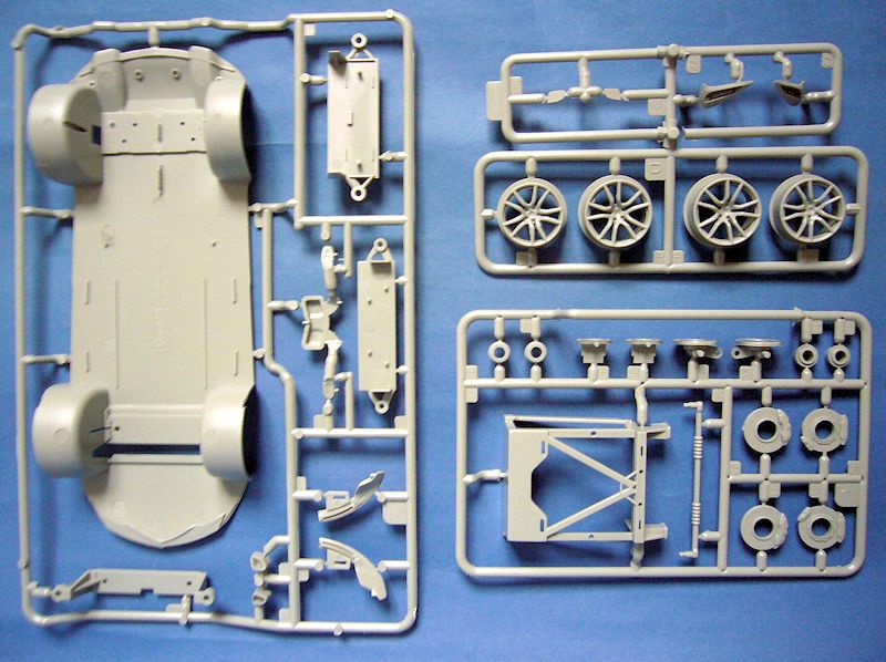 Bausatz: Revell sei Dank gibt es dieses Fahrzeug auch für die kleine Geldbörse als Modell im gängigen Maßstab 1:24. Die Box zeigt sich im für diese Bausätze üblichen Revell Format und weist mit dem Level 3 darauf hin, dass hier zumindest solide Grundkenntnisse und Fertigkeiten für den Bau des Modells erforderlich sind. Nach dem Öffnen des Kartons findet man 10 Spritzgussäste in unterschiedlichen Farben, die sauber in Klarsichtfolien verpackt sind: