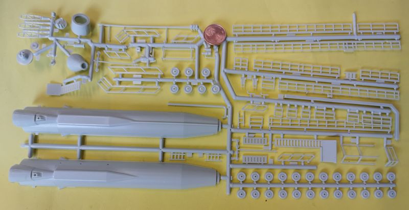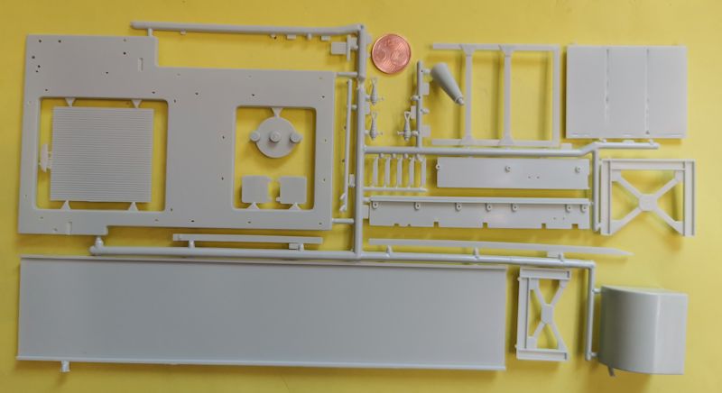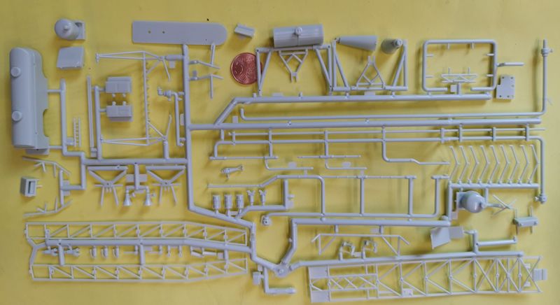 Im praktischen Stülpkarton mit dem Bild des gebauten Models befinden sich insgesamt vier Gussäste mit 150 Teilen, die Bauanleitung und ein Bogen mit Decals. Die Abspritzung ist Anbetracht des Alters der Formen im Großen und Ganzen OK. Es gibt wenige Sinkstellen, und auch Auswerfermarken halten sich in Grenzen.