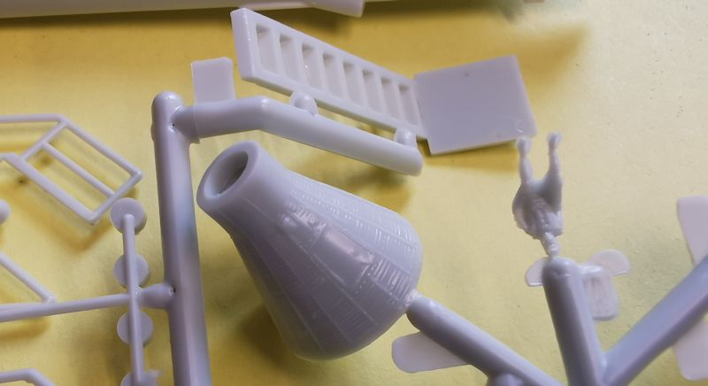 Witzig ist auch, dass ein Astronaut vorhanden ist, den man aber in der Raumkapsel nicht sehen würde, da die Fensteröffnungen nur angedeutet sind. Da wären dann Skalpell und Feile angesagt. Wie zu damaliger Zeit üblich sind die Panellines erhaben gespritzt, womit gerade beim Bau der Trägerrakete Vorsicht beim Verschleifen angebracht ist.