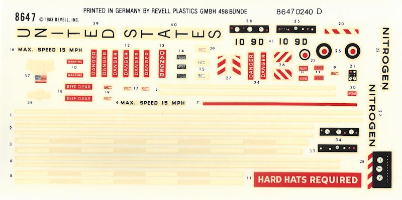 Die Decals wurden wohl von Revell selber gedruckt, sehen aber ganz gut aus. Lediglich die US-Flagge und die drei Kokarden sind etwas aus dem Raster geraten. Die Decals sind allerdings auf Grund des Alters leicht vergilbt. Hier hilft nur eine Behandlung mit UV-Licht (künstlich oder Sonne), damit man sie wieder richtig verwenden kann. Zur Farbgebung lässt sich nicht viel agen. Revell sieht hier lediglich Lufthansagelb, Rot, Mattschwarz, Matt Dunkelgrün und Silber vor (Hauseigene Enamelfarben). Hier sollte man bezüglich weiterer Farben etwas Recherche im Internet betreiben.
