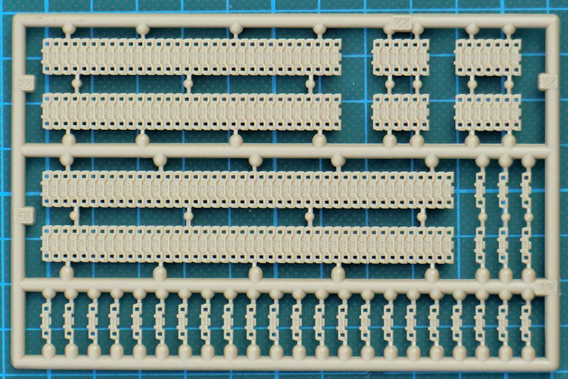 Die Form wurde damals in Korea erstellt und offensichtlich sind die Teile dort auch tadellos abgespritzt. Leider sind die Schwingarme des Fahrwerks an die Wanne anmodelliert. Aus mehreren Segmenten besteht die Kette.