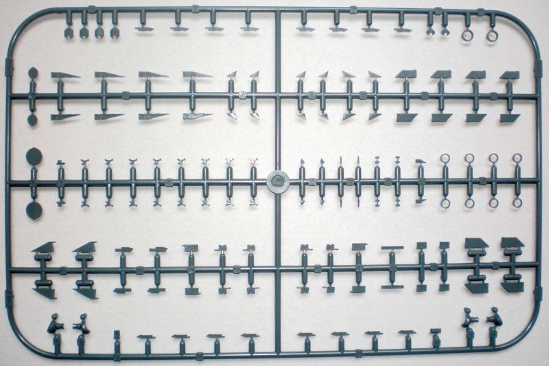Im stabilen Karton befinden sich sieben graue und ein Klarsichtrahmen mit ca. 410 Teilen (von denen für die SMT nur etwa 360 gebraucht werden). Qualität und Passgenauigkeit der Gussäste zeigen keine Alterserscheinungen. Daher entspricht die folgende Beschreibung der damaligen.