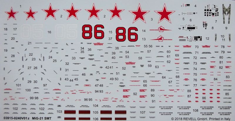 Bemalungsvarianten: Bei den Abziehbildern und Dekovarianten bewegt sich Revell auf Edurads Weekendniveau. Aber der Bogen enthält neben vielen Stencils für Zelle und Waffen auch Abziehbilder für die Instrumente und Sitzgurte. Es stehen eine getarnte und eine graue sowjetische Maschine zur Auswahl.