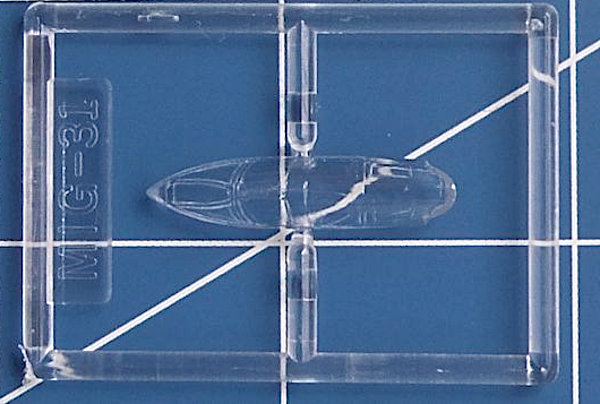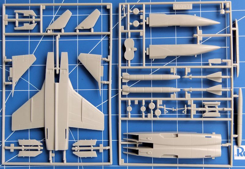 Bausatz: Der Bausatz, den Revell uns bietet, ist selbst für diesen Maßstab sehr einfach gehalten. Ein Cockpit ist nicht vorhanden, so ist der Rumpf in diesem Bereich völlig geschlossen. Allerdings wäre es fraglich, ob durch die kleinen Fenster der Kabine viel zu erkennen wäre. Dafür sind aber die negativen Gravuren dem 144er Maßstab entsprechend sehr fein gestaltet. Die Maße sind stimmig und die Form des Jägers ist für diese Größe gut getroffen. Für die äußere Ausstattung des Modells gibt es zwei Zusatztanks und zwei Mittelstrecken-Luft-Luft Raketen R-40TD.