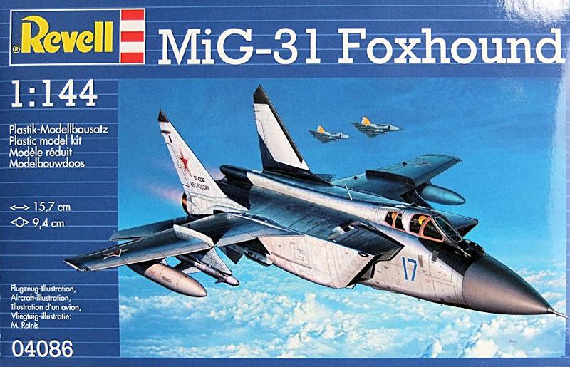 Vorbild: Die MiG-31 ist heute weltweit einer der leistungsfähigsten Langstreckenabfangjäger. Die erste Maschine wurde 1981 in Dienst gestellt und 1983 für einsatzbereit erklärt. 1985 wurden erstmals MiG-31 von norwegischen Jägern abgefangen und fotografiert. Eine Einsatzmaschine der russischen Luftwaffe stellte 2003 sogar 22 Weltrekorde auf. Auf ihrer Gipfelhöhe kam die Maschine auf fast 3000 Km/h (2,82 Mach). Das große Tandemcockpit für zwei Piloten ist auch das auffälligste Merkmal, in dem sich der Abfangjäger von seinem Vorgänger MiG-25 unterscheidet. Die leistungsfähige Elektronik ermöglicht das Abfangen von tieffliegenden Luftzielen. Derzeit stehen ca 200 MiG-31 im Dienst der Russischen Föderation und ca.20 in Kasachstan.
