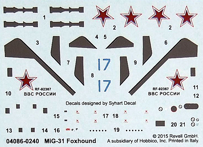 Bemalungen: Es liegen Decals für eine ganz in Grau gehaltende Maschine der russischen Luftwaffe aus dem Jahre 2014 bei.