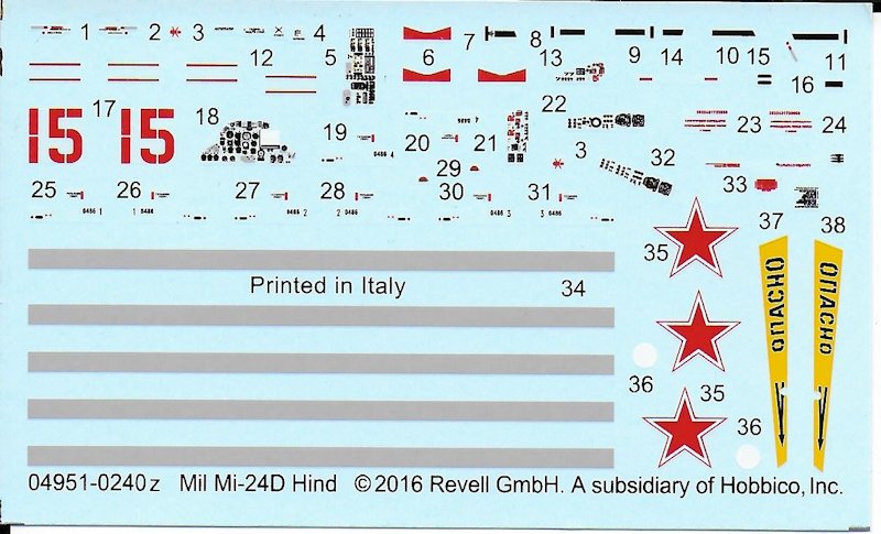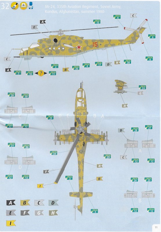 Bemalungsvarianten: Der kleine Decalbogen ist sauber gedruckt und bietet neben Wartungshinweisen und Waffenbeschriftung die Abzeichen für eine Mi-24 der sowjetischen Luftwaffe in Afghanistan 1980.