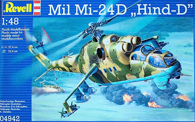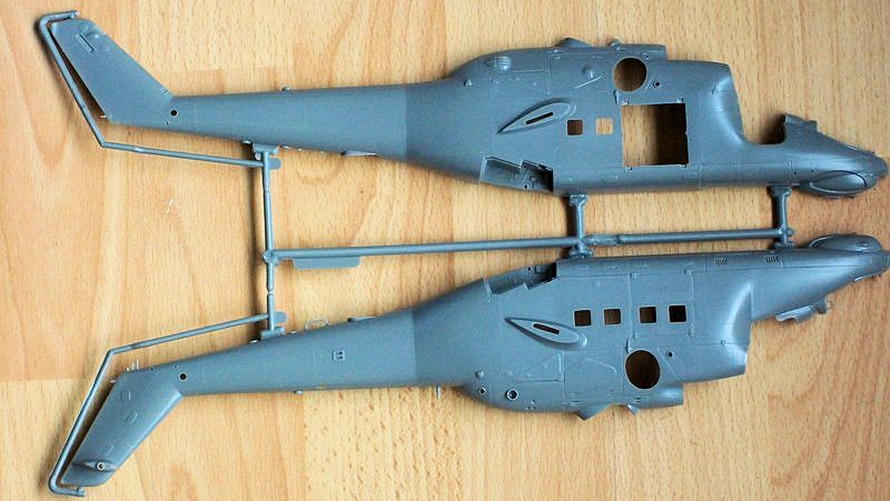 Bausatz: Der 1987er Monogrambausatz wird in einem stabilen Karton geliefert. Die Teile sind gratfrei und sauber ausgegossen. Die Details und die Silhouette des Kampfhubschraubers sind gut wiedergegeben. Die beiden Cockpits und der Transportbereich sind ausreichend, wenn auch nicht unbedingt vorbildgerecht, detailliert. Fürs Cockpit gibt es zwei Piloten. Der mit einigen Details versehene Antrieb verschwindet unter der Abdeckung. Leider wurde die von außen sichtbare Antriebswelle vergessen. Als Bewaffnung liegen vier UB-32 und vier PARL 9M17 "Falanga" oder 9M114 Schturm bei. Die Klarsichtteile sind schlierenfrei.