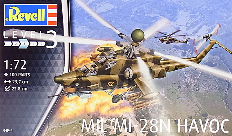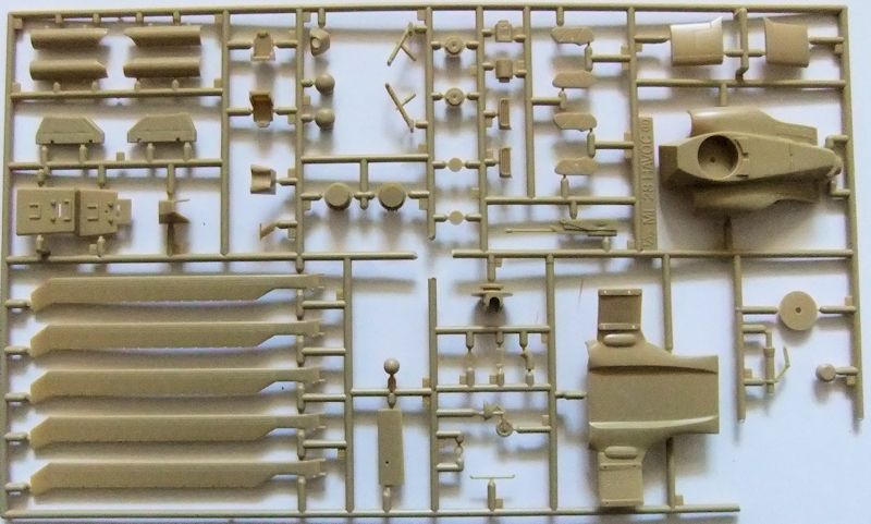 Bausatz: Revell hat diesen Bausatz aus älterer Produktion, ursprünglich von Dragon, der nachtflugtauglichen Variante Mi-28N gewidmet. In dem neu gestalteten, aber immer noch unpraktischen Stülpkarton (Ich denke, meine Generation wird mit dieser Verpackung bis an ihr Lebensende klarkommen müssen) finden wir 100 Bauteile, die sauber aber auch einfach gestaltet sind.