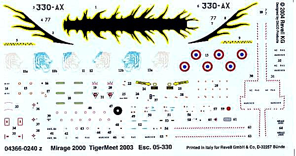 Bausatz: Es handelt sich hierbei um einen Italeri - Bausatz, der jedoch mit einer interessanten Bemalungsvariante wieder bei Revell erschien. Das Vorbild ist eine bunte Mühle vom Tigermeet 2003. Die Decals (Abziehbilder) sind sehr gut gedruckt. Leider ist der Streifen für das Seitenruder geteilt, so wird vielleicht Nacharbeit nötig sein. Andererseits ist es aber auch einfacher die Decals in zwei Teile aufzubringen. Damit sind wir auch beim Nachteil dieses Bausatzes: Es gibt nur eine Bemalungsvariante! Als Entschädigung sind auf dem Karton vier Fotos von Details der Originalmaschine vorhanden. Leider sind für die Hauptfarben wieder nur Mischtöne angegeben. Das ist nicht gerade für Einsteiger toll. Vielleicht sollte man auf Produkte der Mitbewerber verweisen oder die Hauptfarben beilegen.