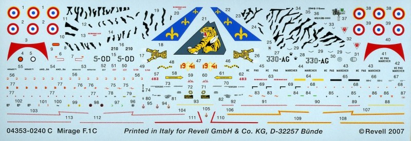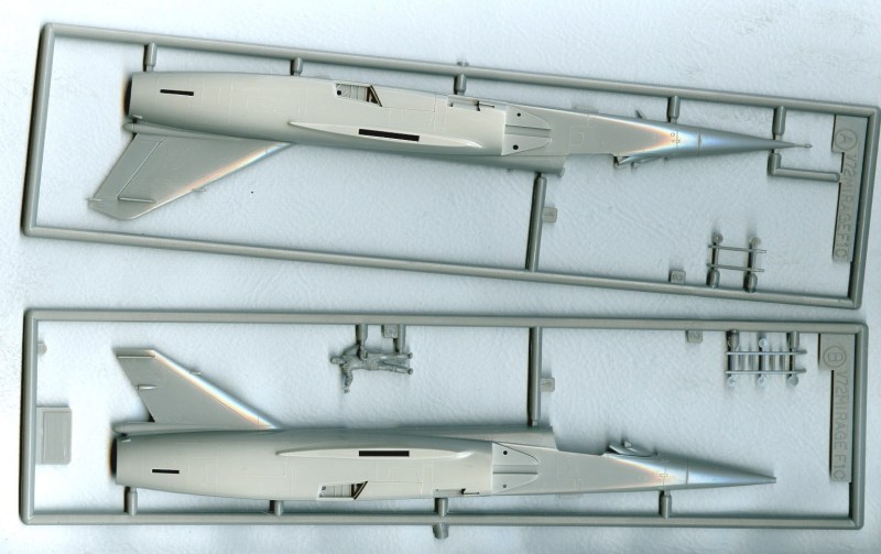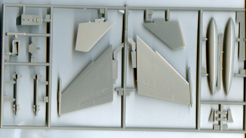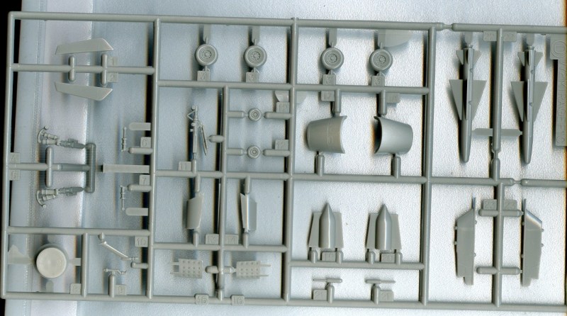 Bausatz: Wer hier nun einen neuen Bausatz der Mirage F.1 erwartet, der wird enttäuscht, denn die Schachtel enthält einen alten Bekannten aus dem Haus Hasegawa. Aus einer überschaubaren, auf vier Gussrahmen verteilten, Teilezahl kann man ein in seinen Abmessungen stimmiges Modell bauen. Der Bausatz verfügt über die notwendige Jägerbewaffnung (je zwei Matra 530 und 550). Eine kleine Zugabe ist die gute Pilotenfigur nebst Einstiegsleiter. Wen die erhabenen Strukturen stören, der sollte auf den Hellerbausatz zurückgreifen (muss aber dafür andere Fehler in Kauf nehmen).