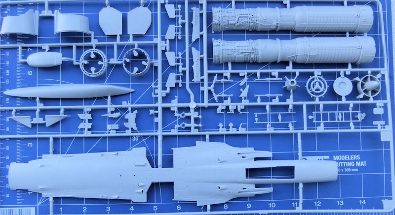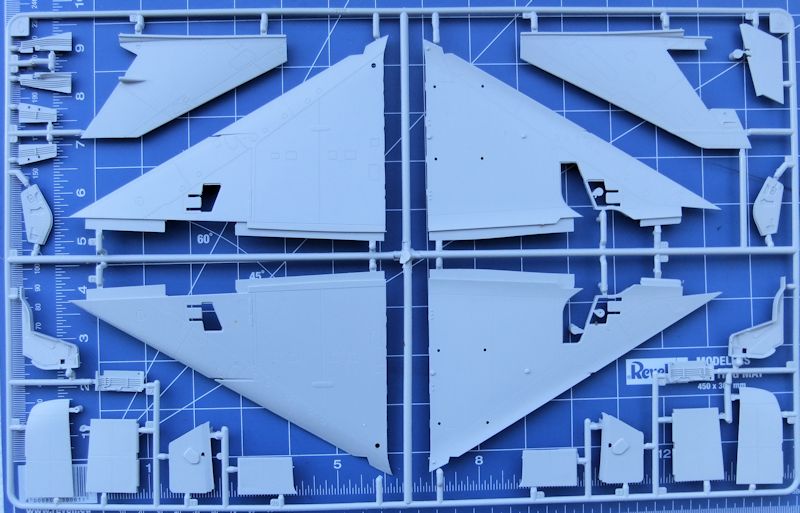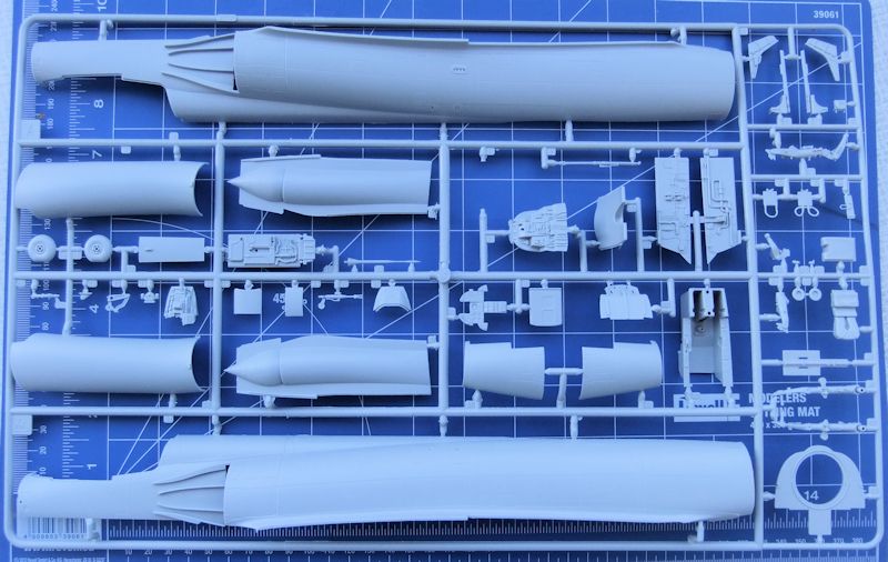 Der große attraktive Stülpkarton beherbergt insgesamt 366 Einzelteile. Aus dem Kasten lassen sich entweder ein Abfangjäger, ein Aufklärer mit Kameras, die auch im Bausatz enthalten sind oder eine Erdkampfvariante bauen. Außerdem kann noch eine Maschine mit einem Störkörper "Barracuda Pod" versehen werden. Dann allerdings ohne sonstige externe Waffen. Das 3 in 1 Konzept des Revellbausatzes ist der erste Vorteil gegenüber dem Original von Italeri, der zweite ist der geringere Preis.