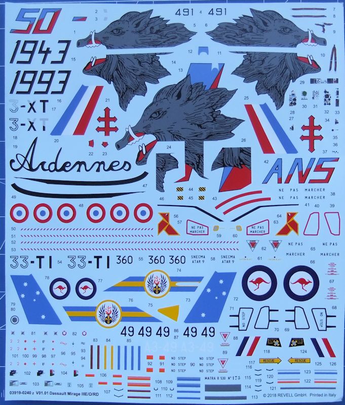 Bemalung: Die Bauanleitung ist farbig gehalten und zeigt auch detailliert die Lackierung der Waffen und der Zusatztanks. Der Decalbogen ist reichhaltig, aber meine letzten Erfahrungen mit Abziehbildern von Revell waren zwiespältig. Auf alle Fälle sollte das Modell eine Glanzlackierung vor deren Auftragen bekommen, da sonst der Trägerfilm silbern könnte. Auf jeden Fall sollte ein Weichmacher für verwendet werden. Es stehen Abziehbilder für drei Versionen zur Auswahl.