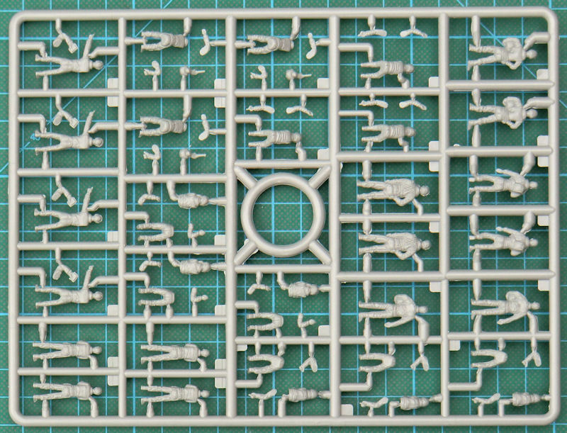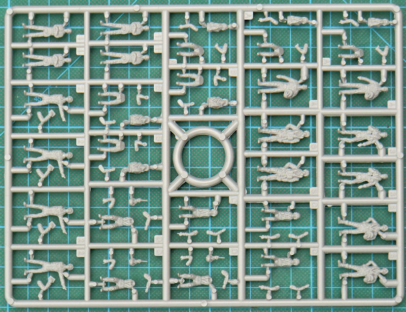 In der recht attraktiven aber unpraktsichen Schüttbox gibt es einen Spritzrahmen mit 65 Teilen für 28 Figuren aus hartem Kunststoff. Diese sind wieder in Kooperation mit PREISER entstanden. Es gibt zwar bei den Figuren einige Dopplungen, jedoch kann der Modellbauer hier die Bauteile gut kombinieren. Die Detaillierung der Figuren ist gut und die Größe ist auch für den Maßstab angemessen.
