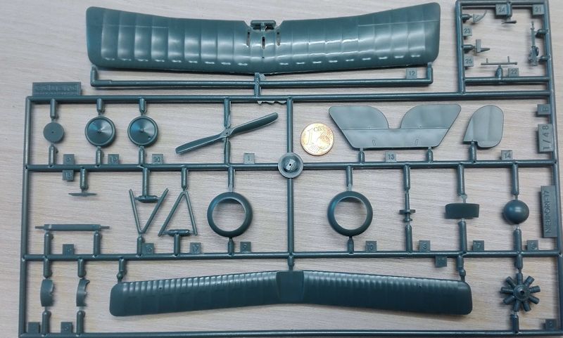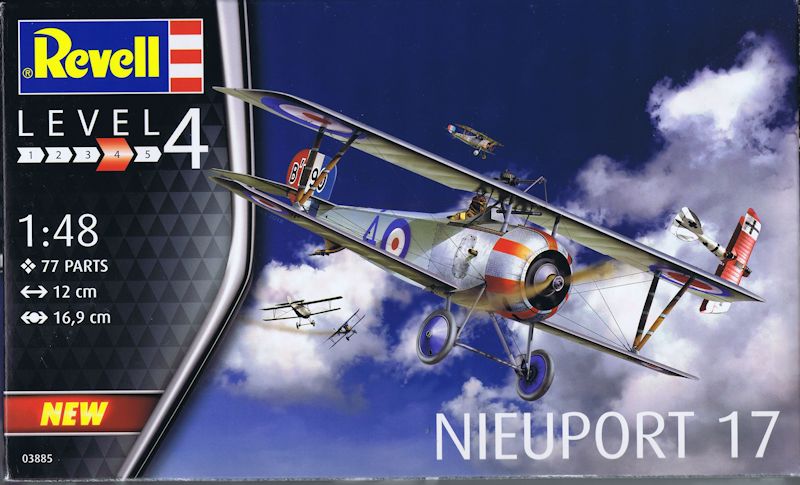 Bausatz: Mit der Nieuport 17 erweitert Revell sein Programm historischer Flugzeuge. Bei dem Bausatz handelt es sich um die "alte" Nieuport von Eduard, die Revell durch Kooperation wieder auf den Markt bringt. Verpackt in der revelltypischen Schüttbox mit schönem Kartonbild findet man zwei Gussrahmen mit 77 Teilen, ein Klarsichtteil für die Windschutzscheibe, eine farbige Bauanleitung und einen kleinen Decalbogen.