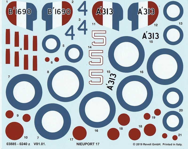 Bauanleitung/ Bemalung: Die 19 seitige Bauanleitung wurde von Revell in der üblichen farbigen Ausführung erstellt, und ermöglicht es schrittweise das Modell zu bauen. Die darin enthaltenen Farbvorgaben (hauseigene Farben) sind nur für die Ausführungen der Nieuport der 1. Squadron des Royal Flying Corps, April und August 1917 in Frankreich vorgesehen. Selbiges gilt auch für die Abziehbilder. Diese sind sauber und versatzfrei gedruckt. Allerdings gibt es zwei Punkte kritisch anzumerken. Die Kokarden müssen aus zwei Teilen zusammengefügt werden, was ungeübten Modellbauern eventuell Probleme bereiten könnte, und irgendwie ist beim Druck das Blau zu flach und grünstichig geworden.