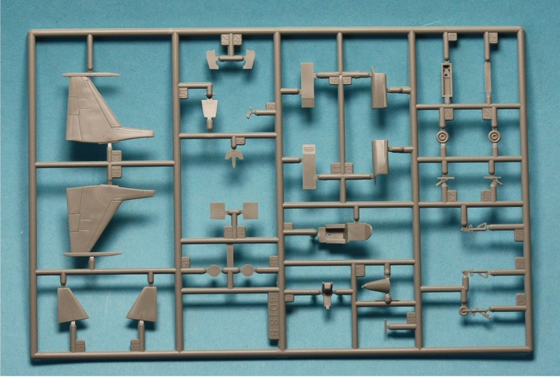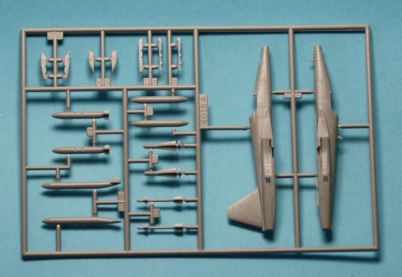 Der erste Eindruck der 50 Teile, die sich auf zwei graue und einen klaren Spritzrahmen verteilen, fällt auch recht positiv aus. So gibt es ein richtiges Cockpit, wofür der Abziehbilderbogen auch ein Instrumentenbrett bereithält. Ein paar Gurte wäre auch hier noch das I-Tüpfelchen gewesen. Die versenkten Gravuren sind nicht superfein, aber auch nicht Gräben. Am Rumpf sind die Nebenlufteinlässe hinter den Tragflächen in offener Position gegossen. Diese Konfiguration ist zutreffend für die Situation der am Boden laufenden Triebwerke. Theoretisch müsste man also einen Piloten oder Techniker ins Cockpit setzen. Die Lufteinläufe sind schön tief gestaltet. Die Tragflächen und Höhenruder sind einteilig und tragen damit zur leichten Baubarkeit bei. Die Abschussschienen an den Tragflächenspitzen sind allerdings falsch herum anmodelliert. Der kurvige Teil gehört nach innen. Das ist kein sehr großer Fehler und er lässt sich leicht korrigieren, für die Jenigen, die sich daran stören.