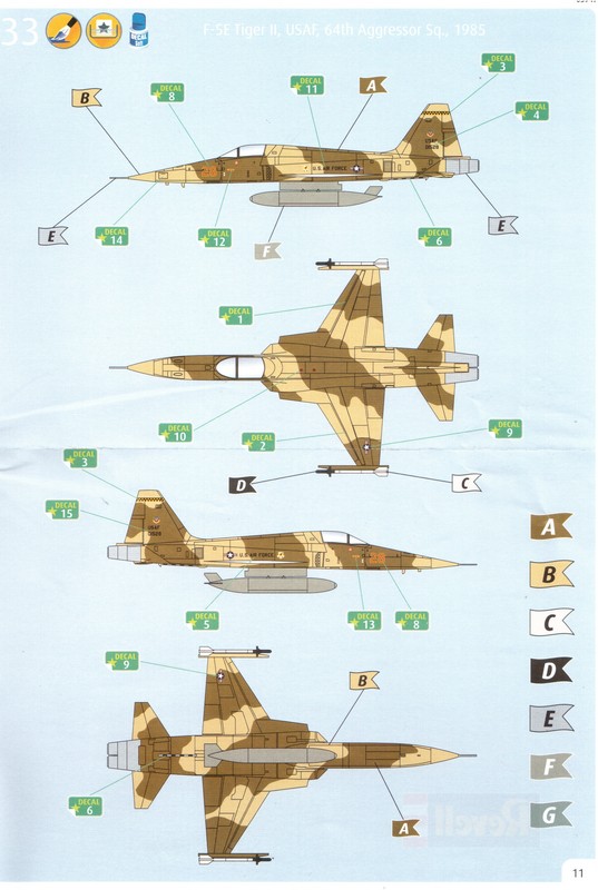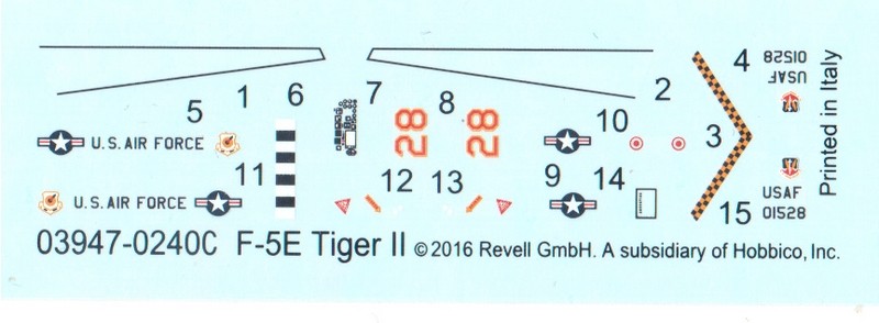 Die Farbangaben beziehen sich auf das Revell Programm. Gut sind die Angaben für die Detailbemalung während des Baues. Um scheinbar den Kostenrahmen von 4,99 Euro Verkaufspreis nicht zu sprengen, liefert der beiliegende Decalbogen nur (noch) eine Bemalungsoption. Dabei handelt es sich um eine Aggressormaschine der USAF. Der matte Bogen wurde in Italien gedruckt und macht einen guten Eindruck.