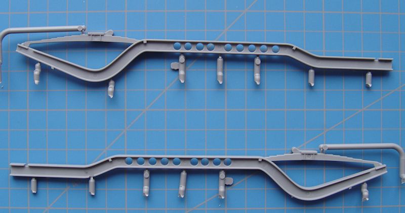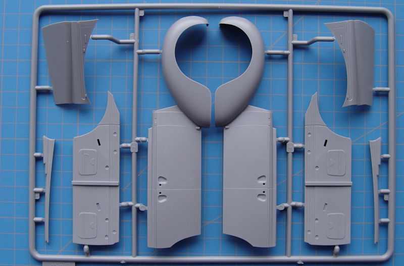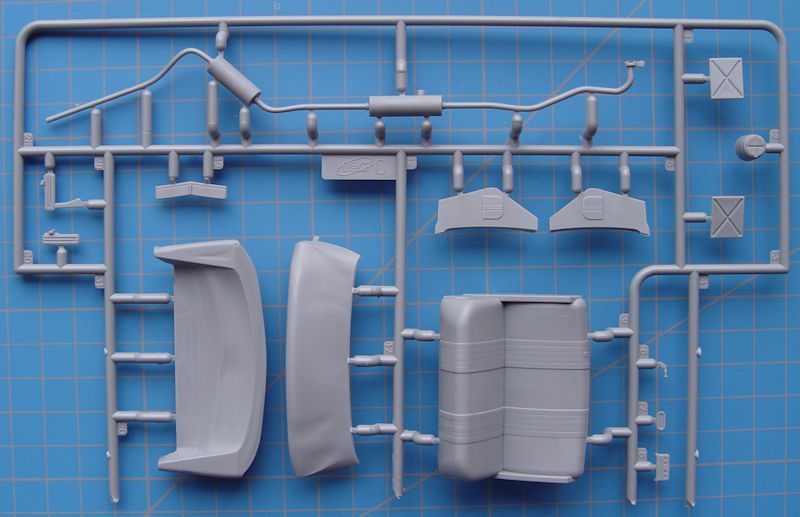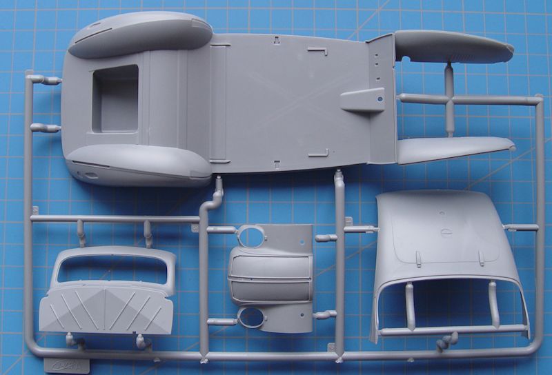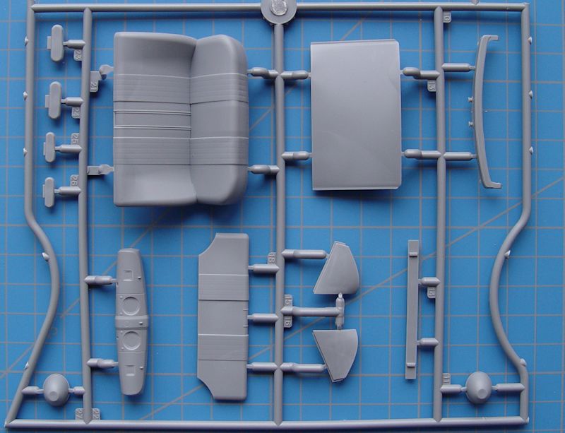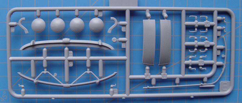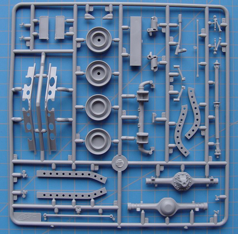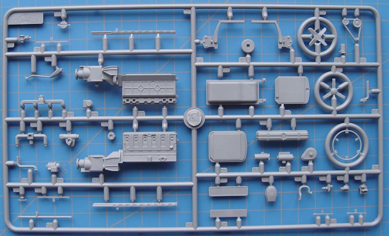 Die 145 Teile finden wir an vier großen, und einem kleinen Spritzrahmen, aus grauem Kunststoff. Sie sind alle sauber gegossen. Im Bausatz enthalten ist ein schön gestalteter Motor mit Getriebe.