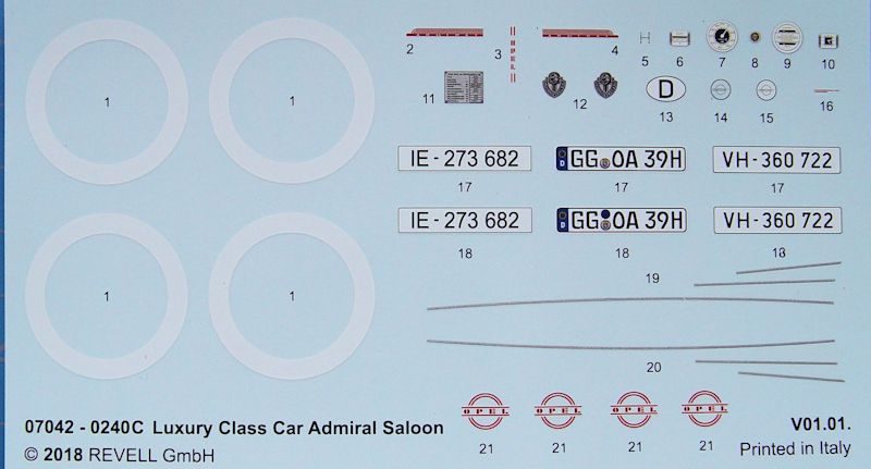 Bauanleitung/Bemalung: Die Bauanleitung ist gut und sehr übersichtlich gestaltet. Sie ist ein Farbdruck mit 22 Seiten und in 49 Abschnitten untergliedert. Man kann sagen, dass hier nicht viel Arbeit auf einen wartet, und dass man dieses Modell prima in einer Woche schaffen kann. Der Decalbogen ist gut gemacht. Er enthält drei verschiedene paar Nummernschilder, Opel-Embleme für die Radkappen und Kotflügel, sogar Tacho-Decals sind abgebildet. Weiterhin gibt es weiße Ringe- für die Darstellung von Weißwandreifen. Aber dann die Decals auf Vinyl kleben?