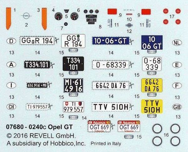 Bausatz: Getreu nach dem Motto: "Irgendwann kommt alles wieder", so auch der neu Opel GT von Revell. ER hat schon mehr als 45 Jahre auf dem Buckel und war früher wie heute als einfacher "snap together" konzipiert und wurde gerne für die Carrera Bahn verwendet. Leider sind die alten Vinylreifen mit der Aussparung für den "Weißwandring" nicht mehr vorhanden, sie wurden durch weichere Gummireifen ohne Aussparung ersetzt, warum auch immer? Ein korrigierter Hinweis befindet sich im Bausatz. Dafür beinhaltet der Bausatz heute sehr gute Decals für Armaturen und Kennzeichen. Ansonsten wurde der alte Bausatz so übernommen wie er 1970 erschien, damals in grünen - heute in orangen Plastikteilen.