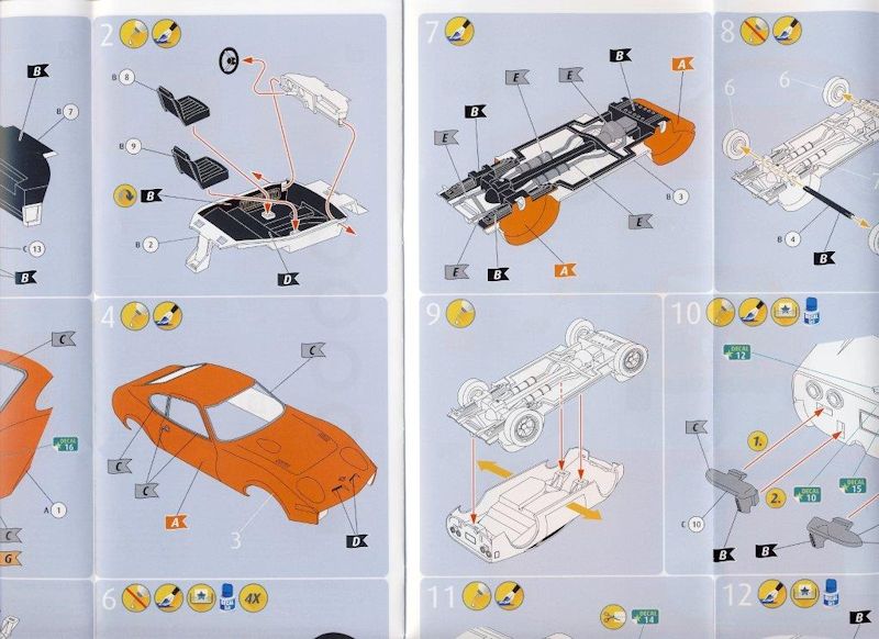 Geliefert wird der Bausatz in der bekannten Side-Open-Box mit einer wie immer sehr guten Autoillustration. Er besteht aus ca.25 Bauteile die in orange, klar und metallgrau abgespritzt sind. Ferner finden sich vier Gummireifen und die bekannten sehr guten Decals in der Box. Dank der neuen farbigen achtseitigen, sehr übersichtlichen Bauanleitung (mit ausführlichen Farbangaben) dürfte der Zusammenbau dem Anfänger, wie auch dem fortgeschrittenen Modellbauer keine Schwierigkeiten bereiten.