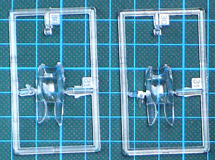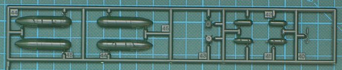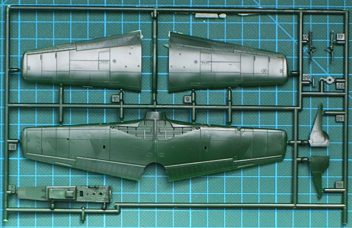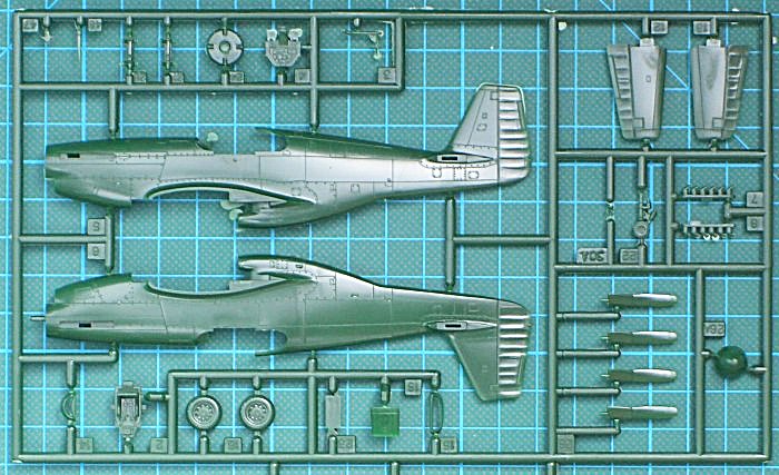 Interessanterweise lag die Kanzel doppelt bei. Dabei war die eingepackte Kanzel doch mit viel mehr Grat versehen und sah etwas schlierig aus. Da die Bauanleitung nicht darauf eingeht, möchte ich hiermit darauf hinweisen, dass die Hauptfahrwerksklappen am Boden wieder einfuhren. Nur wenn die Hydraulik keinen Druck hatte, dann gehorchten sie den Gesetzen der Schwerkraft. Für eine Einsatzmaschine also unreal. Als Außenlasten gibt es den sog. "Papertank" und alternativ Bomben.