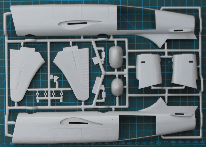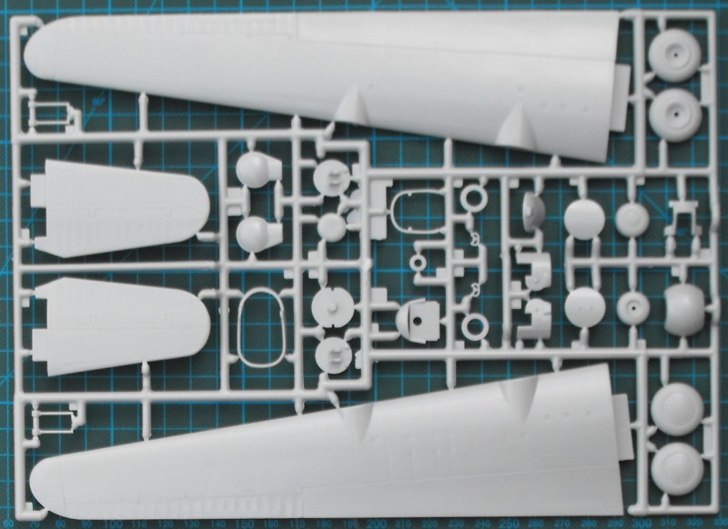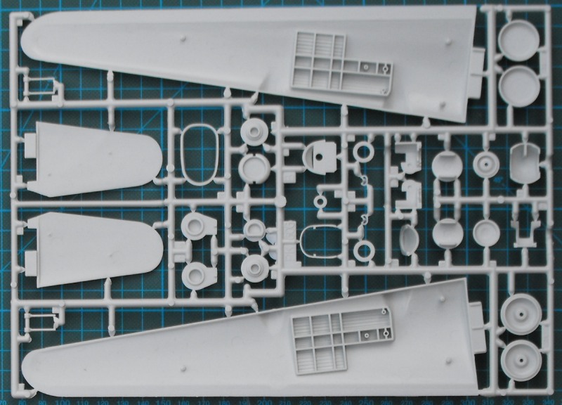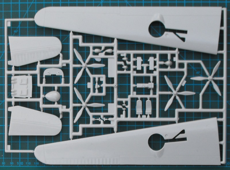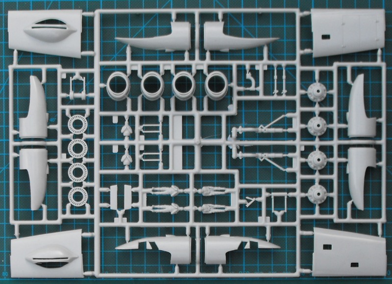 In der stabilen Schüttelbox befinden sich vier hellgraue Spritzlinge, ein Rahmen Klarsichteile und ein Decalbogen. Die Bauanleitung ist sehr gut gemacht. Trotz des Alters sind die Strukturen noch recht ordentlich. Hier gibt es feine aufgesetzte Linien. Alles ist natürlich nicht vergleichbar mit den Details bei Hasegawas B-24 oder Revells Lancaster...