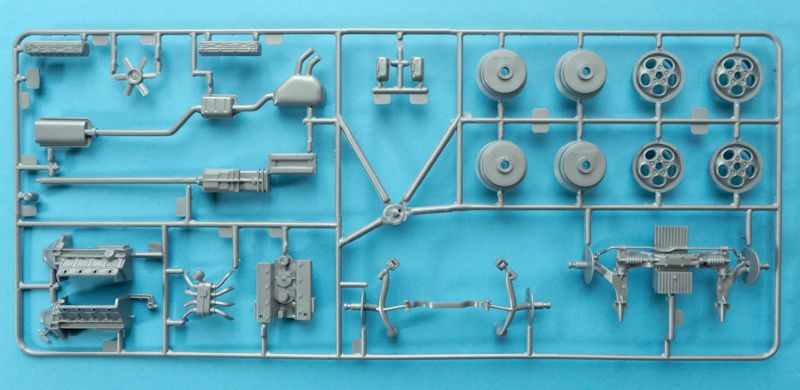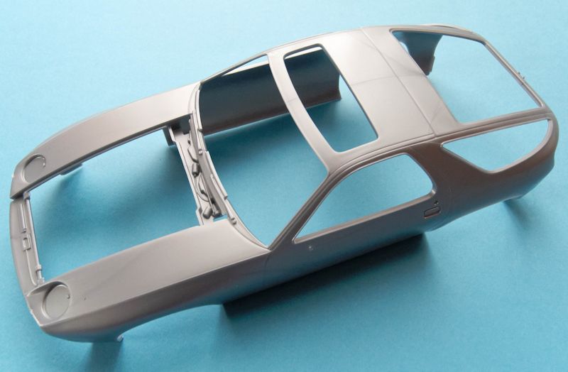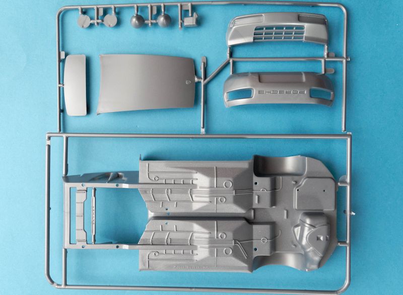 Die Form des Wagens wurde proportional gut und detailliert umgesetzt. Die Sicken der Türen und des Tankdeckels sollten hier noch leicht nachgearbeitet werden. Der Aufbau des Fahrgestells gestaltet sich sehr einfach, da sowohl Vorder- als auch die Hinterachse nur aus je einem Teil bestehen.