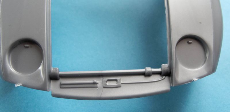 Der Innenraum mit Armaturenbrett ist schön detailliert und besitzt eine gute Stoffstruktur. Leider sind hier auch auf den sichtbaren Stellen einige Auswerfer, ungünstig, platziert und am fertigen Modell somit auch sichtbar. Die Sitze verfügen über eine sehr gut gemachte Lederstruktur. Leider hat einer davon eine tiefe Einbuchtung die verspachtelt werden müsste.