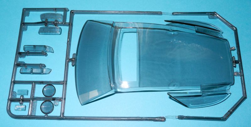 Leider sieht man den Einzelteilen an, dass die Formen schon einige Jahre auf dem Buckel haben. Durch den großen Maßstab gibt es nur insgesamt 62 Teile, um diesen 28cm langen Wagen zu bauen. Diese bestehen, neben der Karosserie, aus zwei silberfarbenen Spritzlingen, zwei schwarzen für den Innenraum, einen in Rauchglas getönten für die Gläser sowie vier Gummireifen.