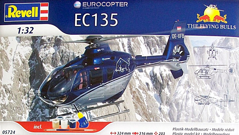 Der vorliegende Bausatz besteht aus dem bekannten Revell Bausatz der Eurocopters EC 135. Neu sind die Abziehbilder für die Red Bulls Version des Hubschraubers und dem Bausatz liegen ein Pinsel, Klebstoff und die Revell Acrylfarben Beige 374 Seidenmatt, Aluminium 99, Ultramarin Blau 51 Glänzend, Farblos 01 Glänzend und Grau 374 Seidenmatt bei.