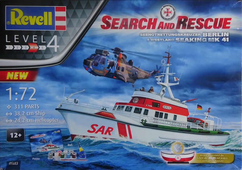 Bausatz: Revell unterstütz mit diesem Bausatz die DGzRS. Der große Klappkarton enthält zwei Modelle mit Abziehbildern, Farben, Leim und Pinsel, ein Poster sowie die Bauanleitung.