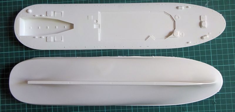 Die Deckaufbauten, das Tochterboot und andere Kleinteile befinden sich an fünf weißen Gussästen.