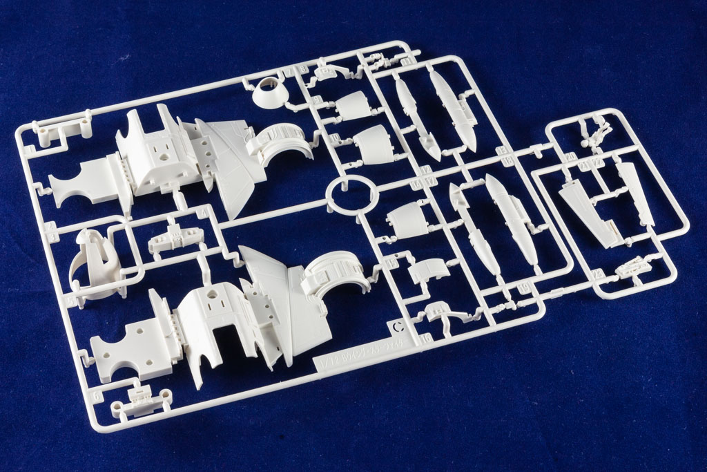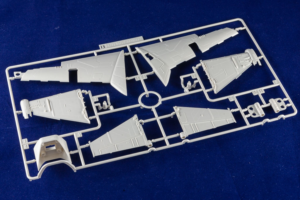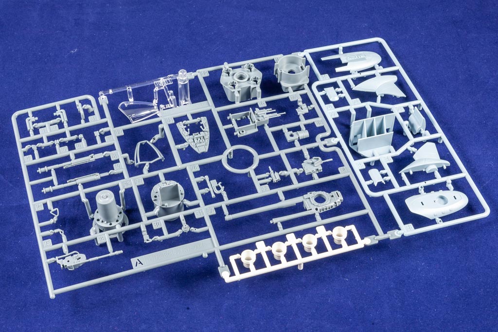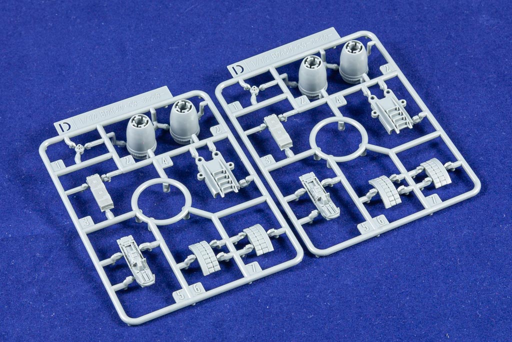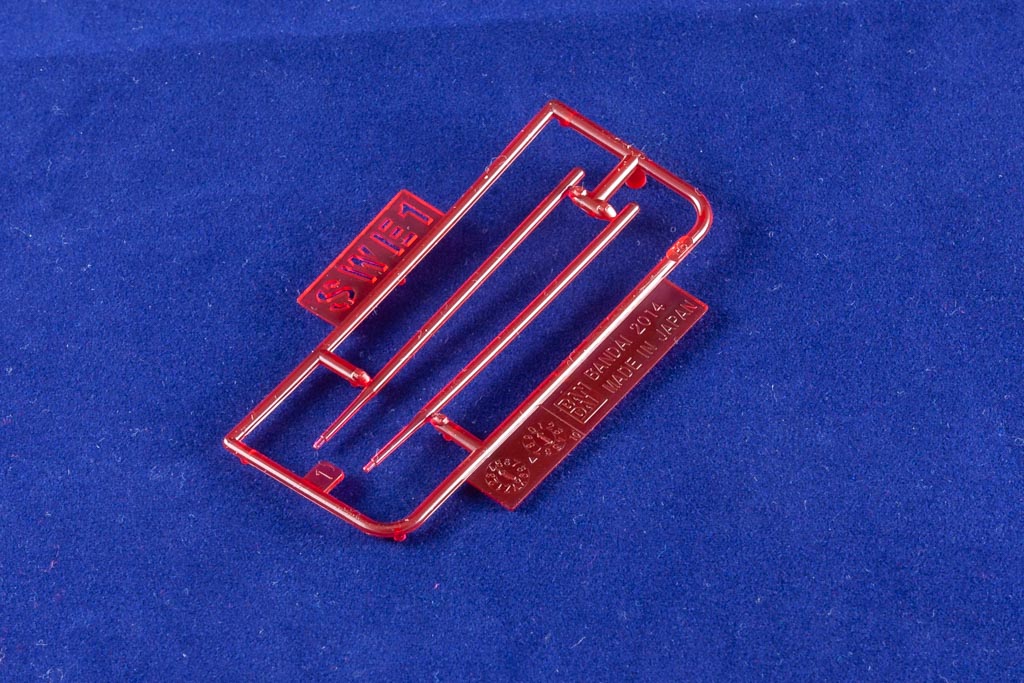 Die Teile enthalten sehr feine und präzise ausgeführte Details, die ihresgleichen suchen. Der Bausatz bietet die Wahl zwischen einer Kanzelhaube als Klarteil oder (so wie beim Filmmodell) einer Haube nur aus Rahmen und ohne "Glas". Der vierfache Triebwerksauslass ist als Lichtleiter ausgeführt, so dass es sehr einfach ist, ihn mit einer zentralen LED zu beleuchten. Bandai bietet hierzu auch einen eigenen Beleuchtungskit an.