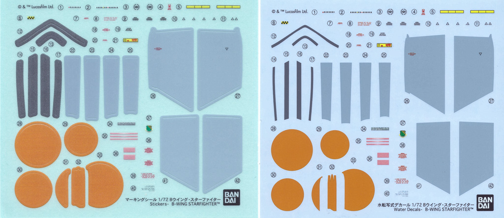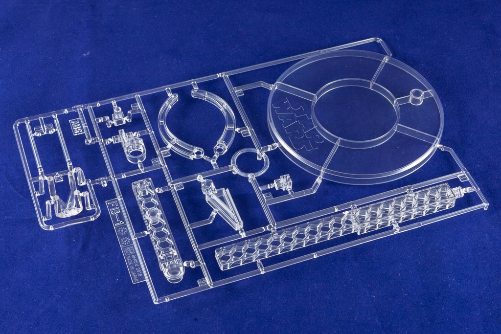 Die Bauteile und Gussäste sind bereits in den Grundfarben des B-Wing ausgeführt. Dass man den Formenbau meisterlich beherrscht, beweist Bandai durch den präzisen Einsatz von vier verschiedenen Plastikfarben in einem einzigen Gussast (Nr. A), dabei auch Klarteile, sowie durch den Einsatz der Slide Mold-Technologie an Gussast B, um Details an normalerweise nicht zugänglichen Stellen zu erzeugen.