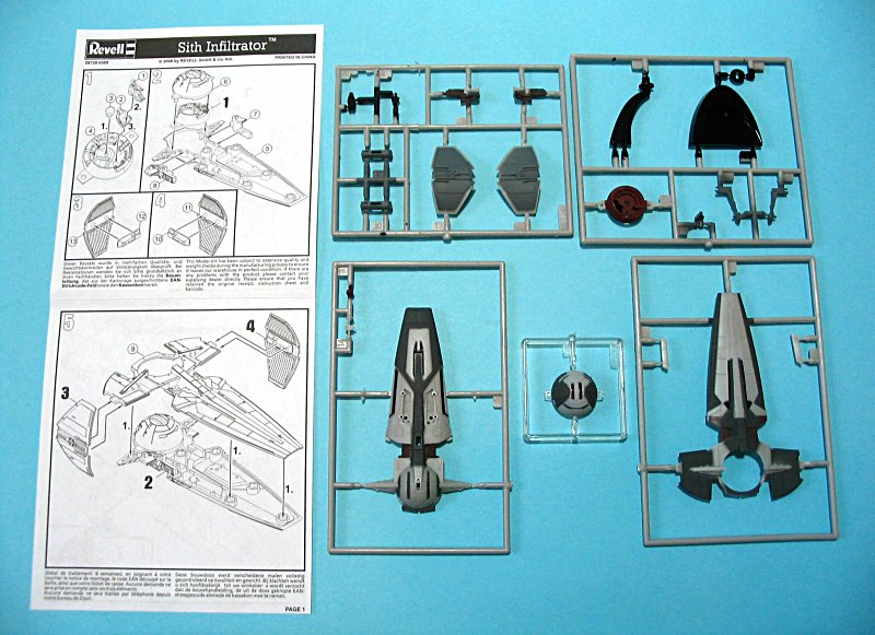 Im Film nur relativ kurz zu sehen, Darth Mauls "Sith Infiltrator" von der Firma Sienar Systems. Obwohl der Infiltrator in etwa die gleiche Größe wie der Falke hat, fällt dessen Modell mit 9,9 cm etwas kleiner aus. Die äussere Form könnte eine Anspielung auf die späteren Tie-Fighter sein, um damit eine Brücke von der neuen zur alten Trilogie zu schlagen, was die Designs der Schiffe angeht. Interessant bei diesem Kit, es liegen zwei Figuren bei, ein sitzender Darth Maul und dann noch eine stehende Gestalt.